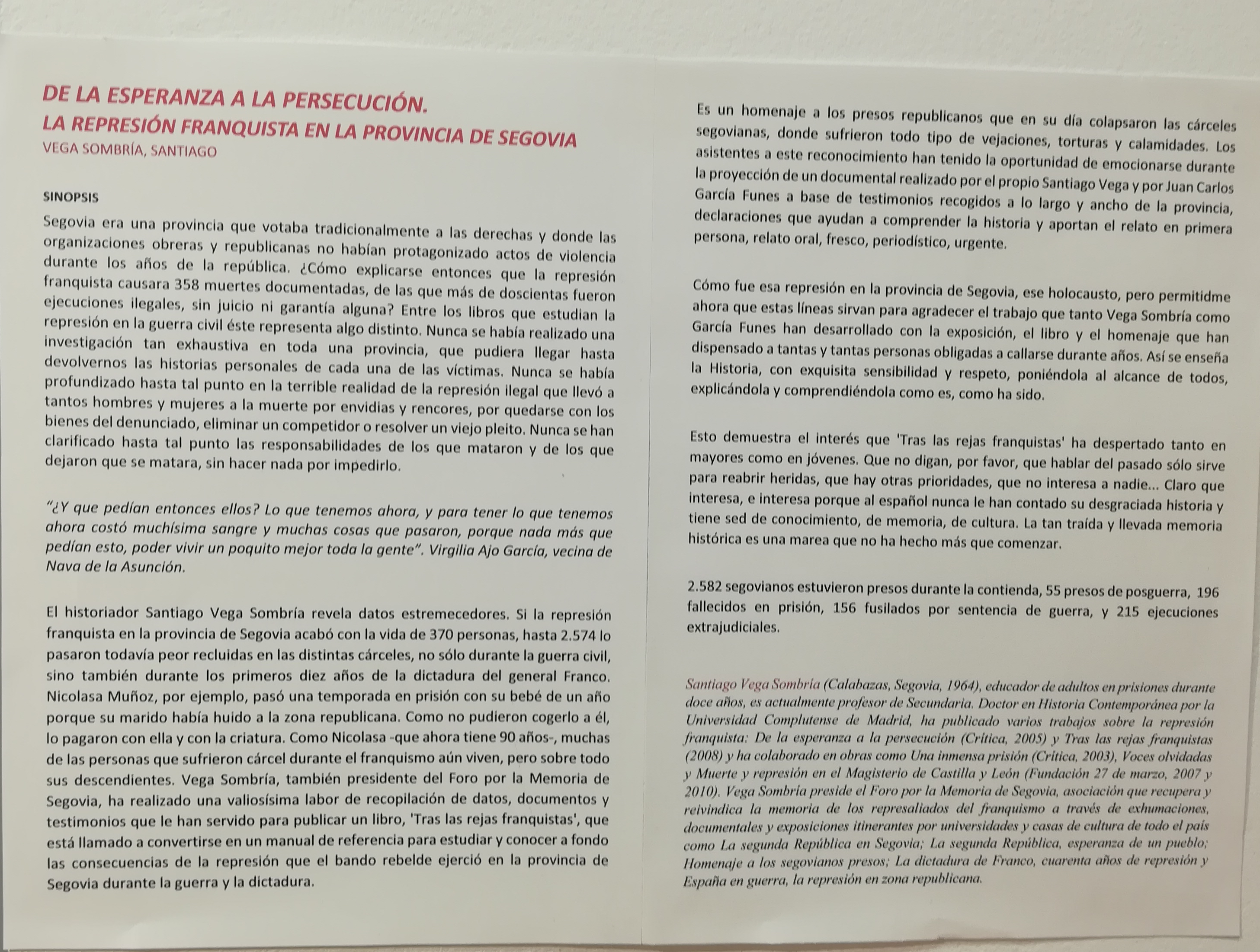 Hay que ver la exposición porque sin memoria no hay historia y sin historia no hay futuro. La memoria es un instrumento insustituible para escribir la historia, sobre todo la más reciente y dolorosa, por terrible que sea su relato, por respeto a los hechos y a las víctimas pero, sobre todo, a las generaciones futuras que tienen el derecho a conocerla sin tergiversaciones, manipulaciones y mentiras para no repetir los errores del pasado.
